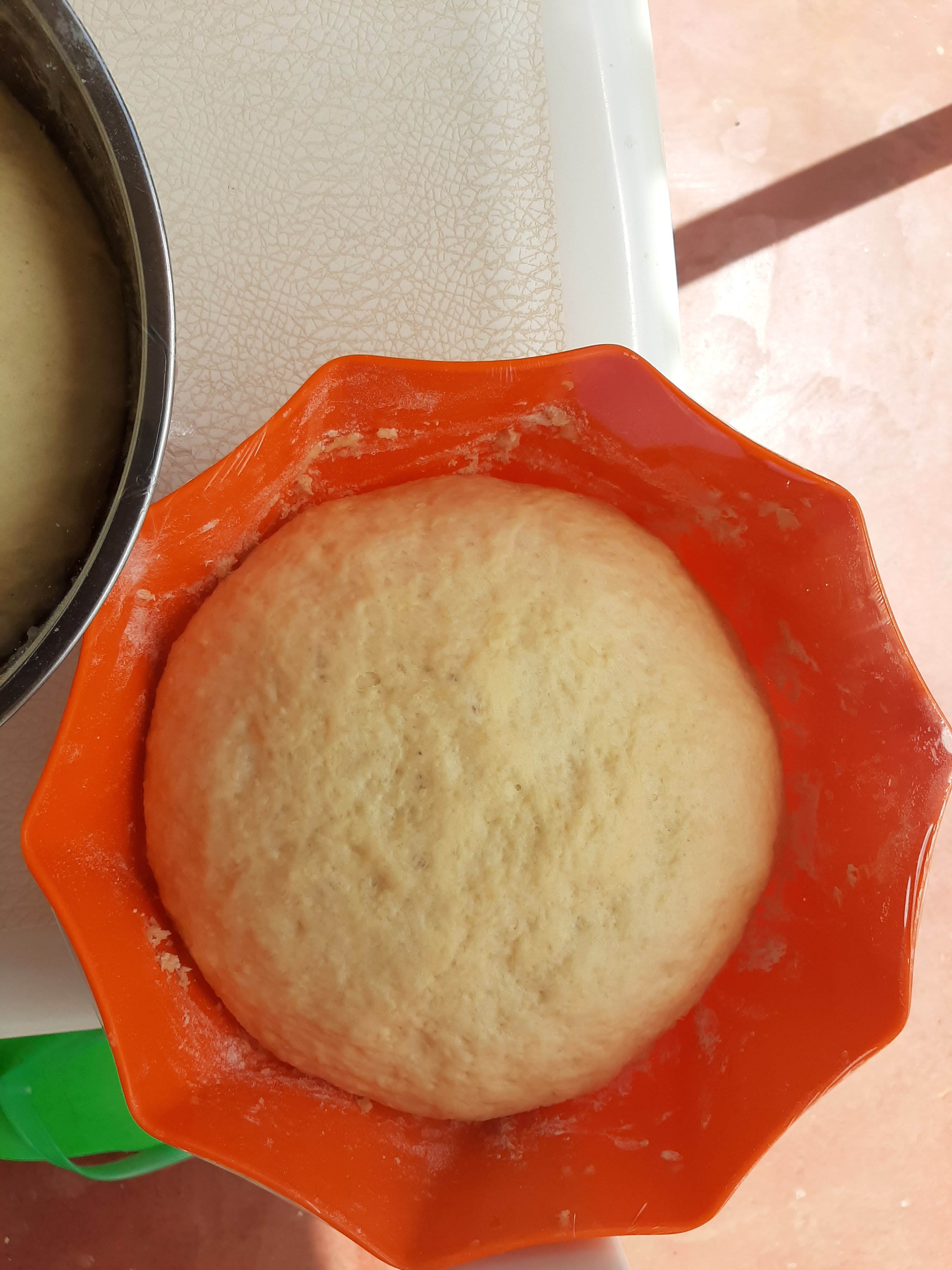 - Cover with a damp kitchen towel and let the dough rise for 1 and 1/2 hours until it doubles in size. I like to make use of the sun at the window.