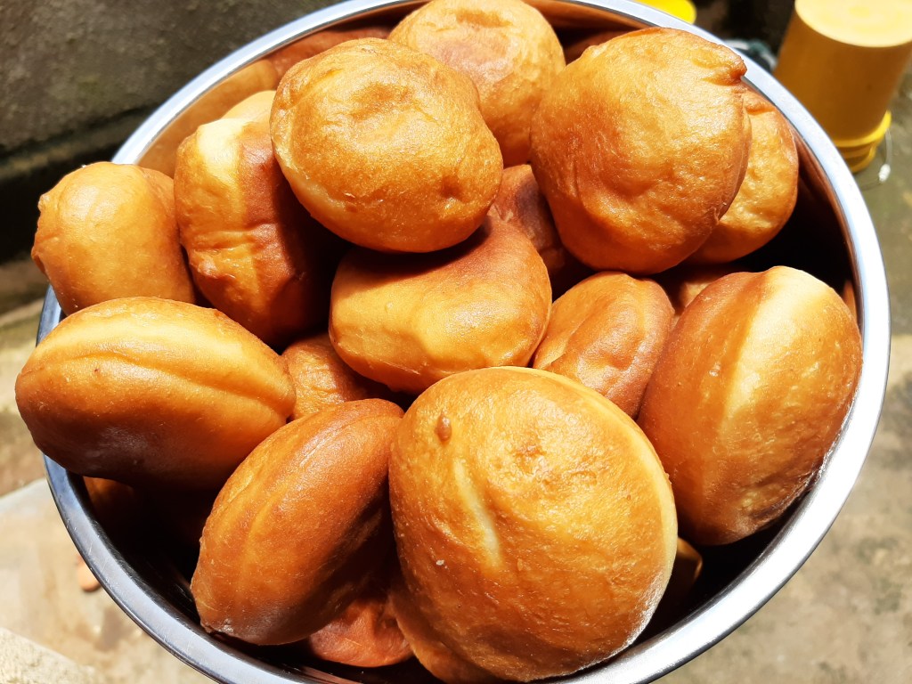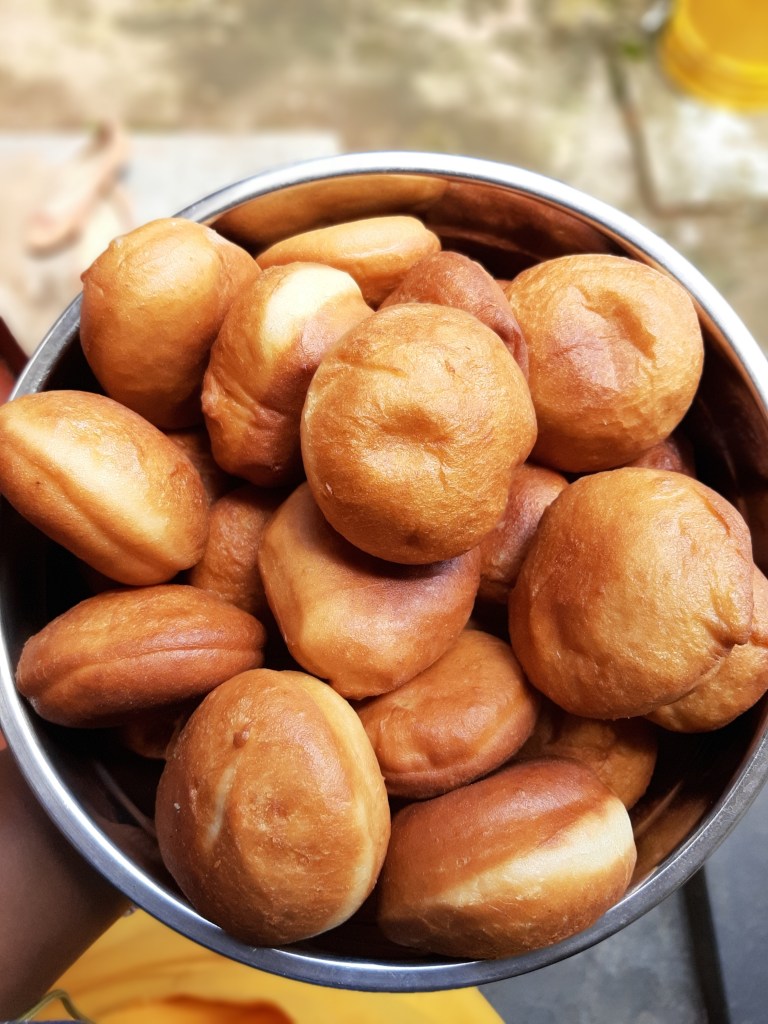 - Deep fry the doughnuts on moderate heat till a light golden colour on both sides. Drain the doughnuts once out of the pan.