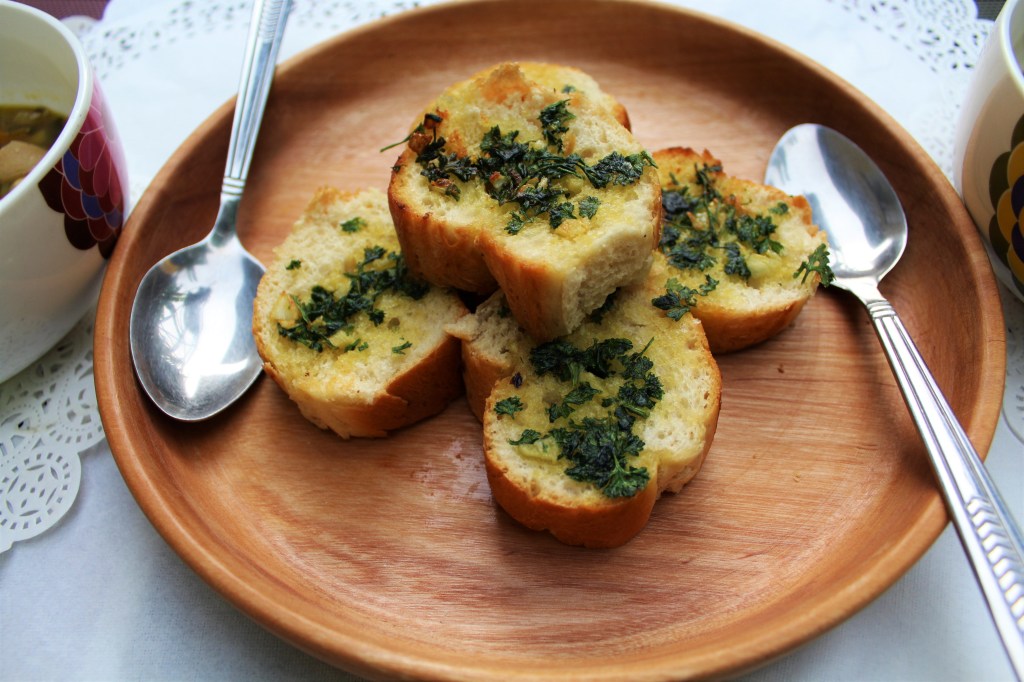 - In a bowl, mix softened butter, finely chopped garlic, salt and finely chopped parsley.
